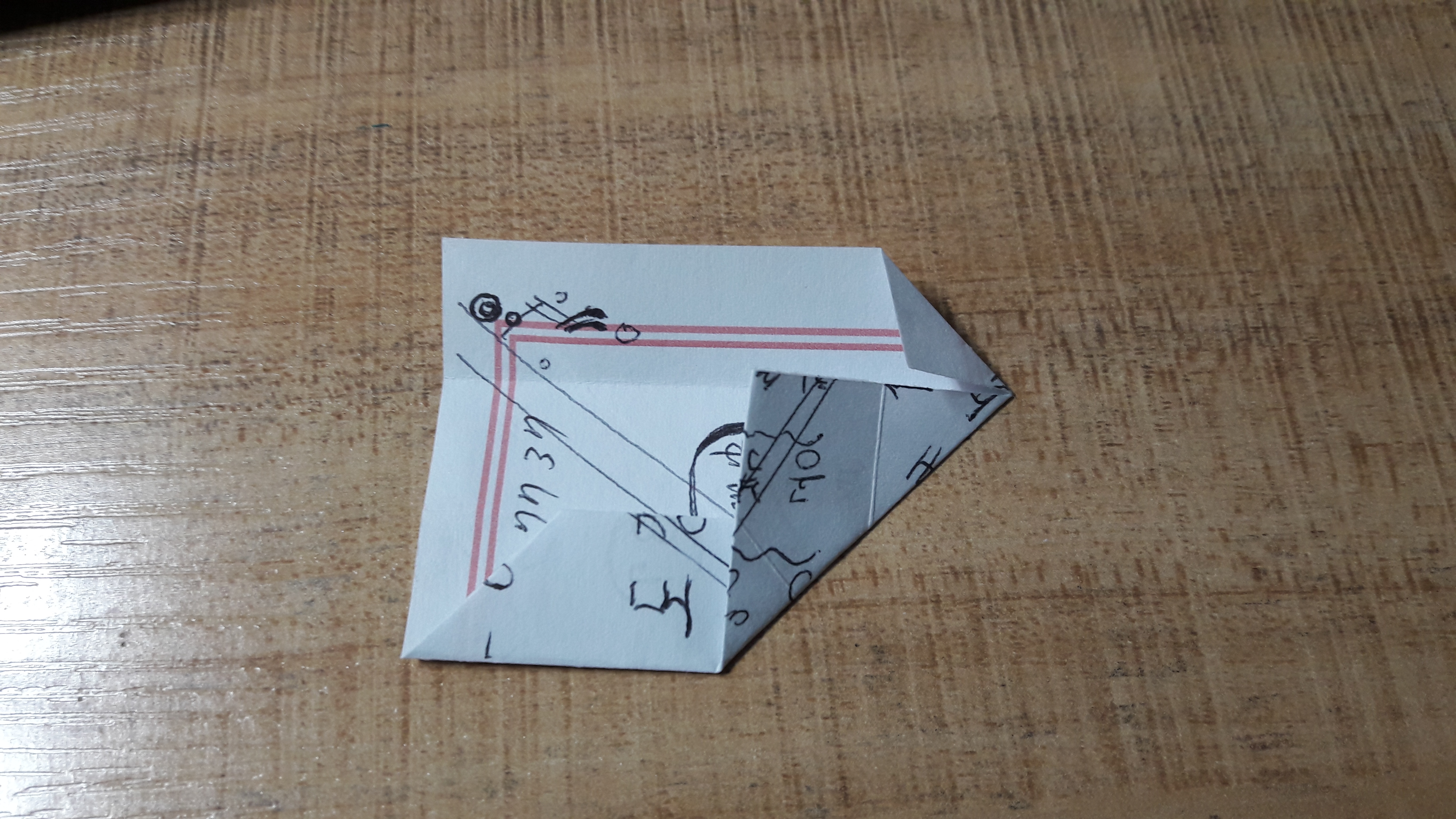 종이는 이면지를 사용합니다 이면지도 뒷면까지 메모로 다 써먹은 더 이상 기록으로는 사 먹을 수 없는 종이를 모아서 재활용 하지요 위의 그림과 같이 정사각형으로 된 종이를 한쪽 방향으로 4번 접어준 뒤에 마지막 한쪽 끝을 사진과 같이 세모로 접어줍니다