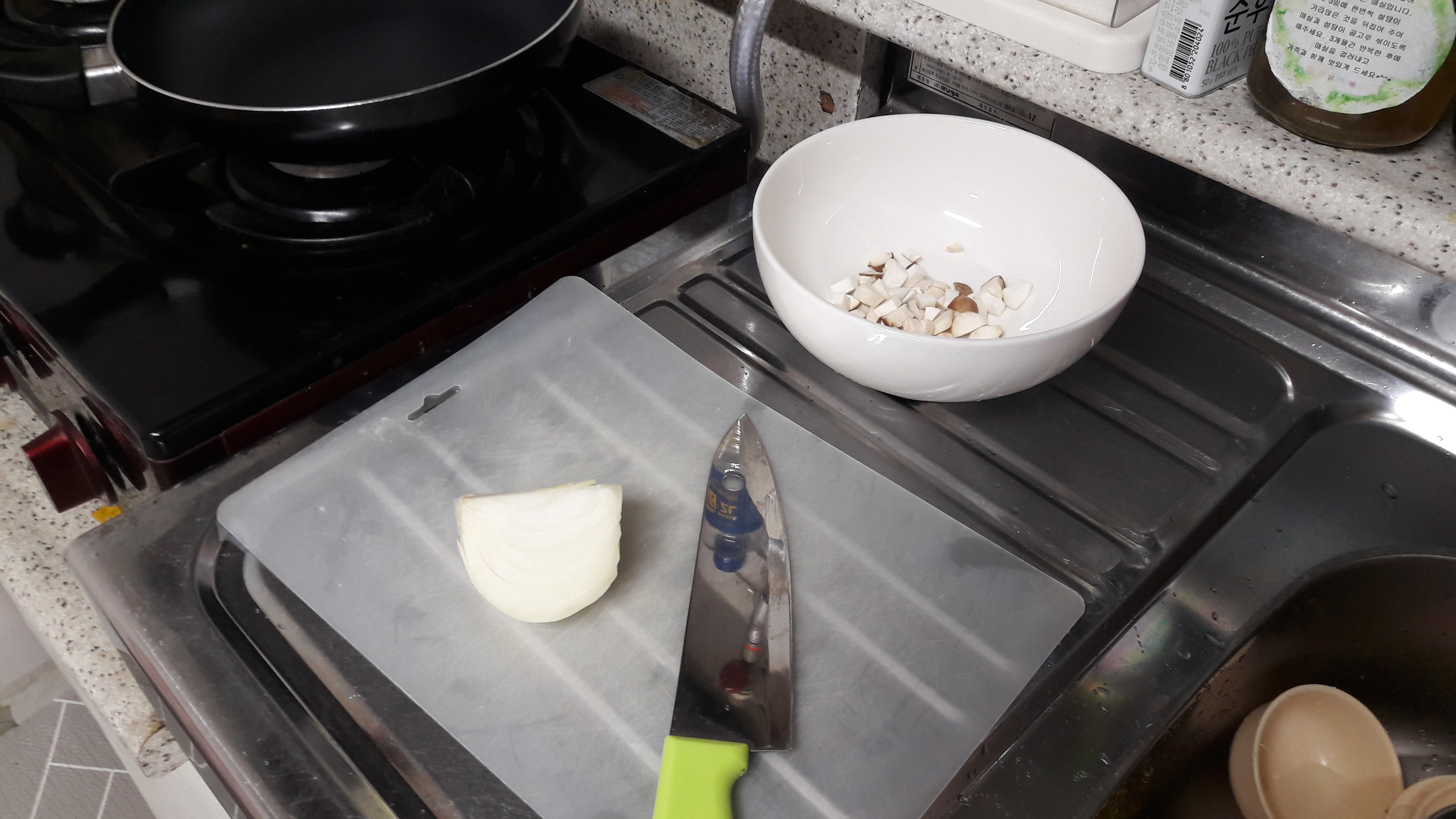 우선은 잘게 자르는게 중요합니다 버섯 세 조각과 양파 4분의 1조각을 아주 아주 잘게 잘라서 별도의 그릇에 담아 주세요
