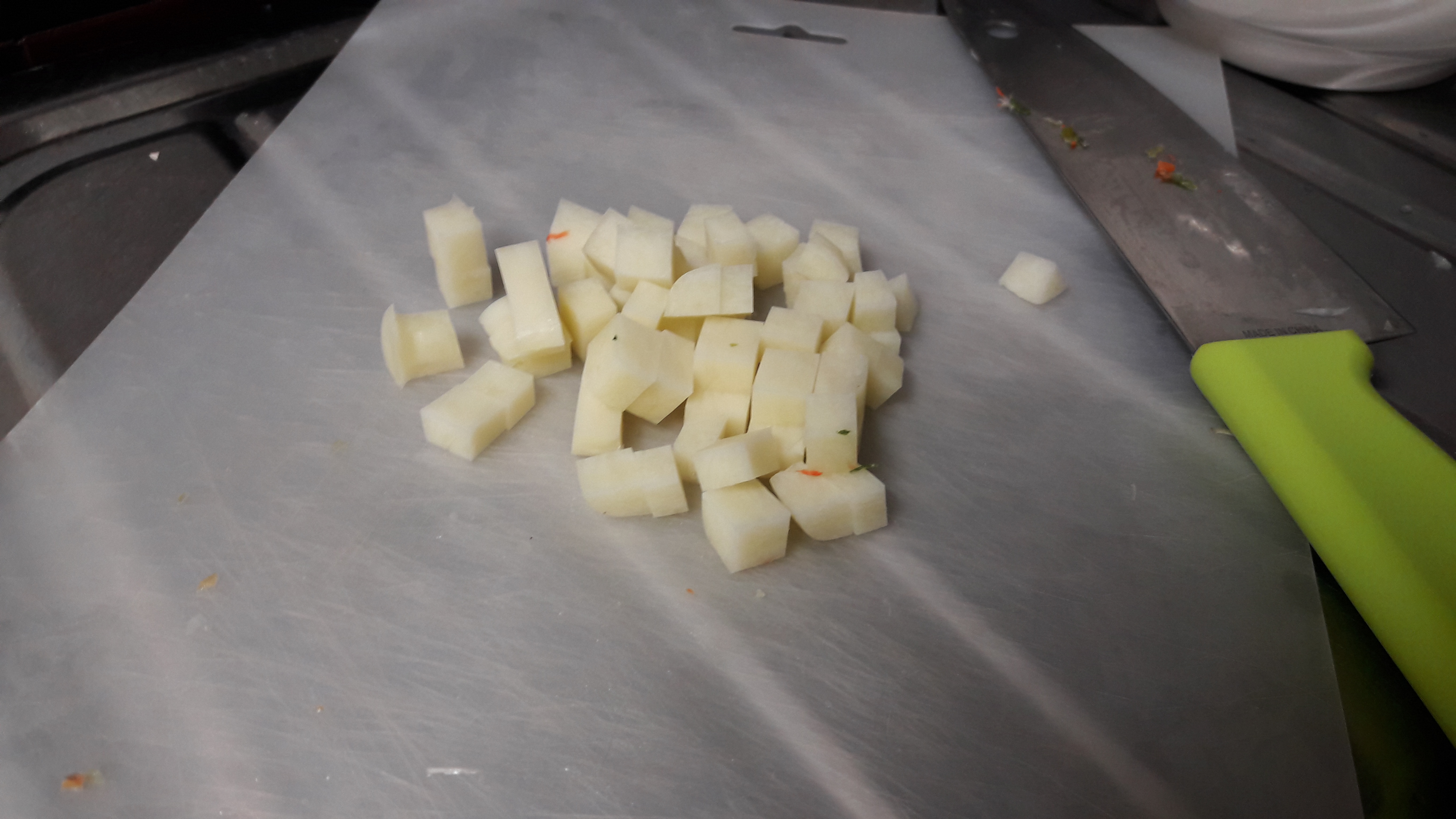 집에 남는 구워 먹는 치즈입니다 예전에 구워 먹을 때는 맛있었는데 어느 순간부터인가 잘 먹지 않기 시작해서 집에 남아 돌고 있습니다 이러다간 언젠가 버릴 것 같군요 여기서 잘게 잘라서 넣어 줍니다 다른 야채들 보다는 조금 길게 잘라 주세요 이 구운 치즈는 식감을 위해서 넣는 재료입니다