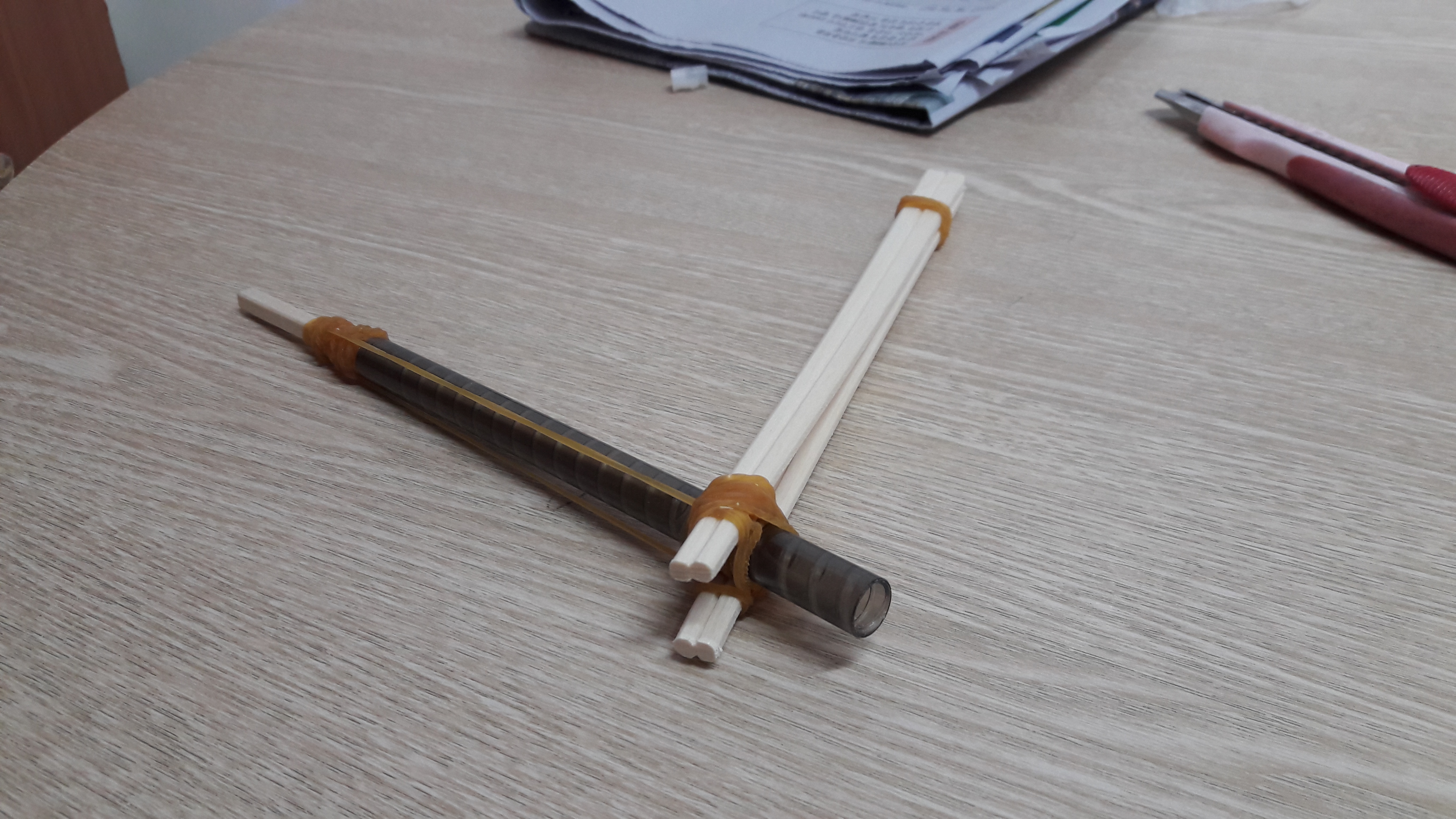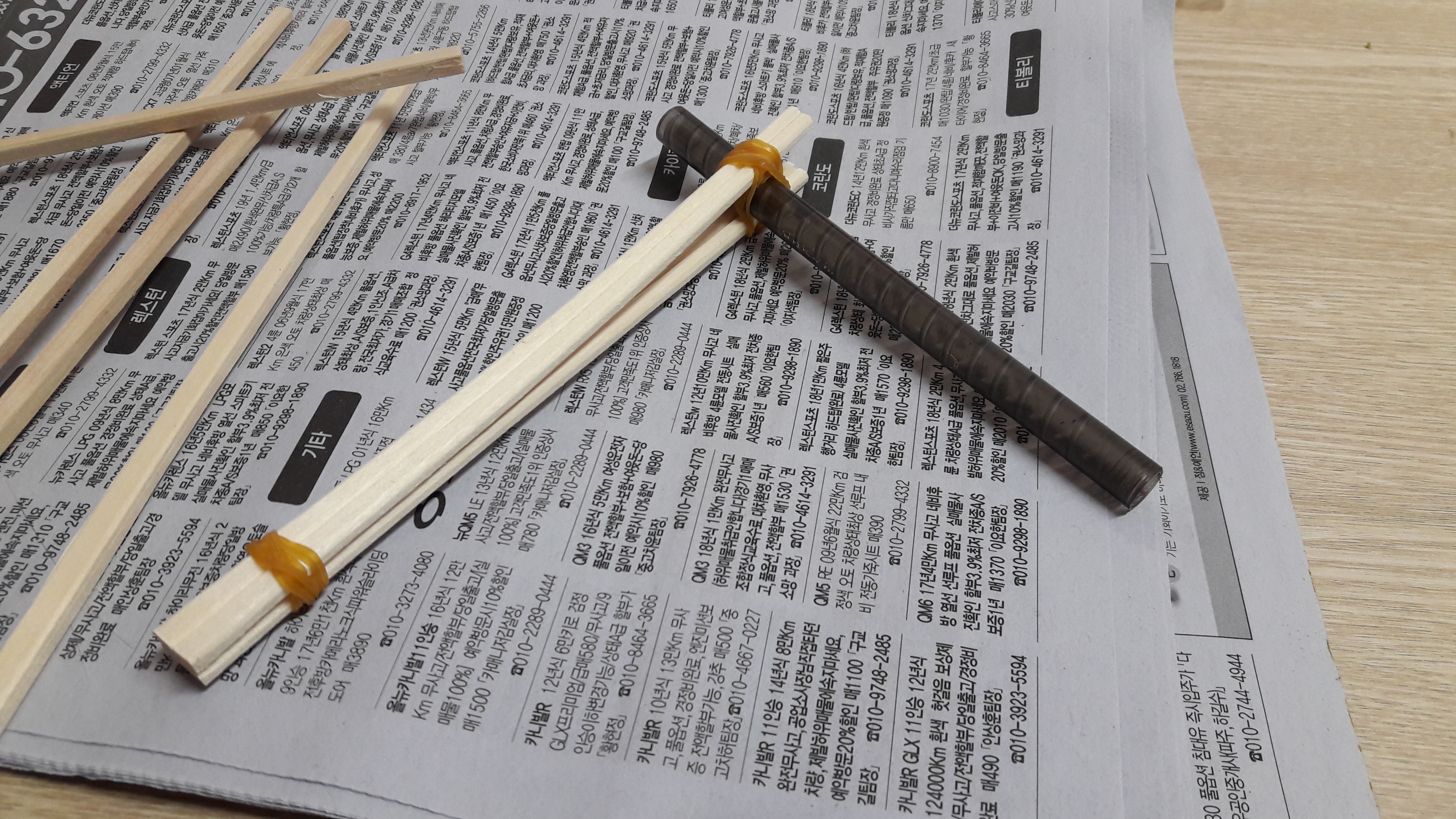 볼펜자루에 나무젓가락 두벌을 고무줄로 연결 - 손잡이(고정지지대)