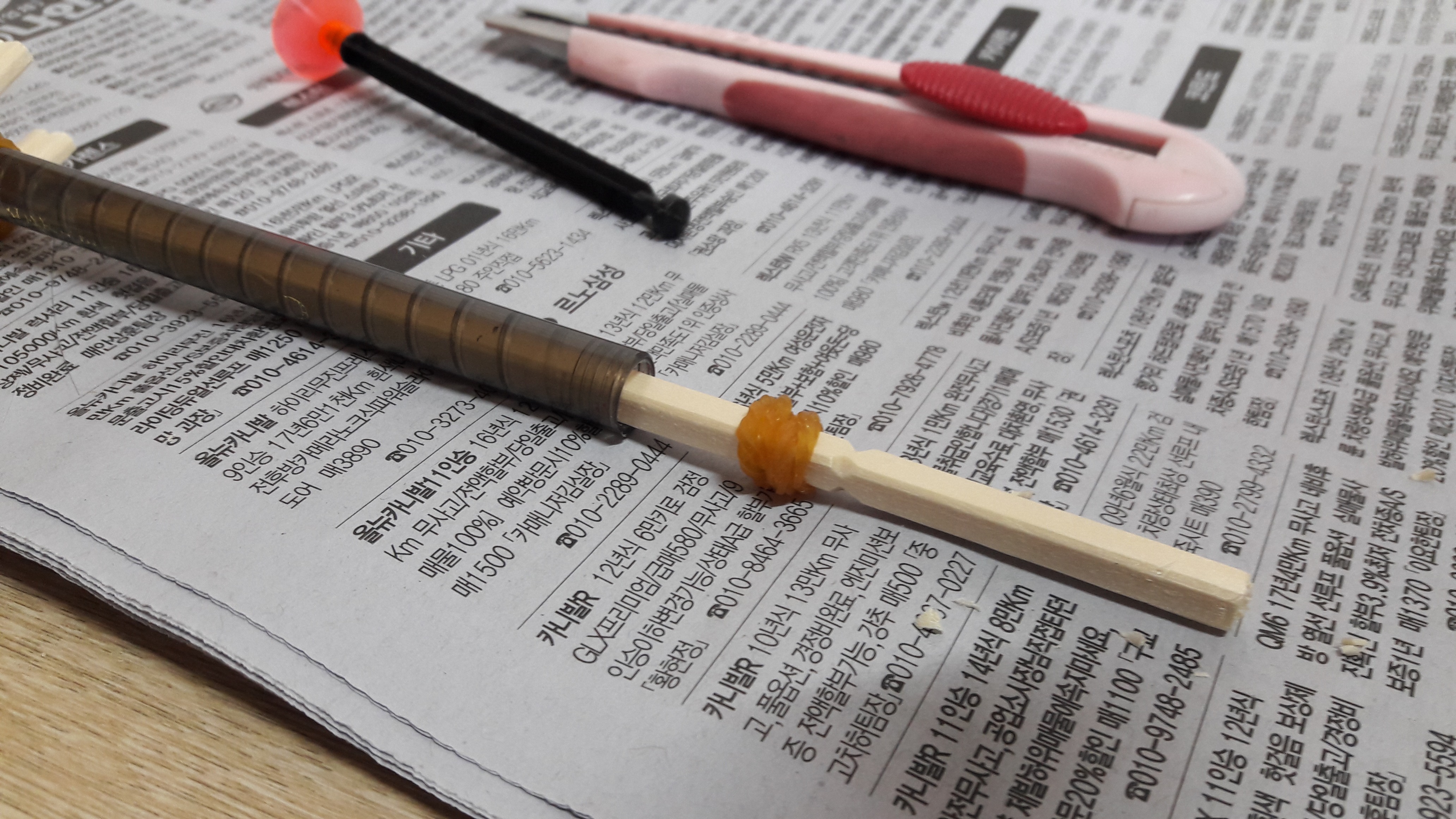 나무젓가락의 두께는 볼펜자루 총신에 들어가서 뻑뻑하지 않을 정도로 한다.