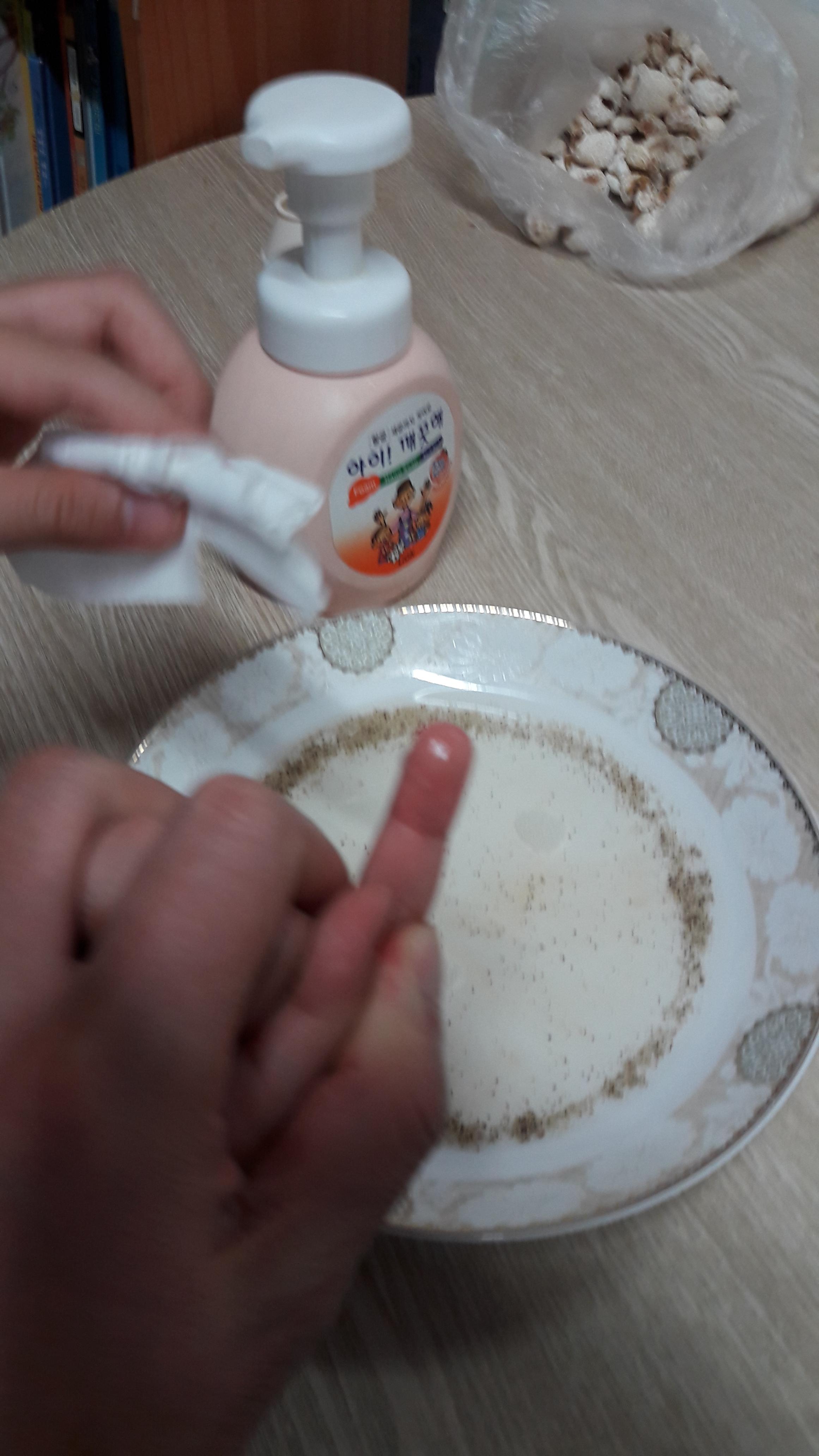 3. 손가락에 세제를 조금 묻힌 후 다시 그릇에 손가락을 대 본다.
