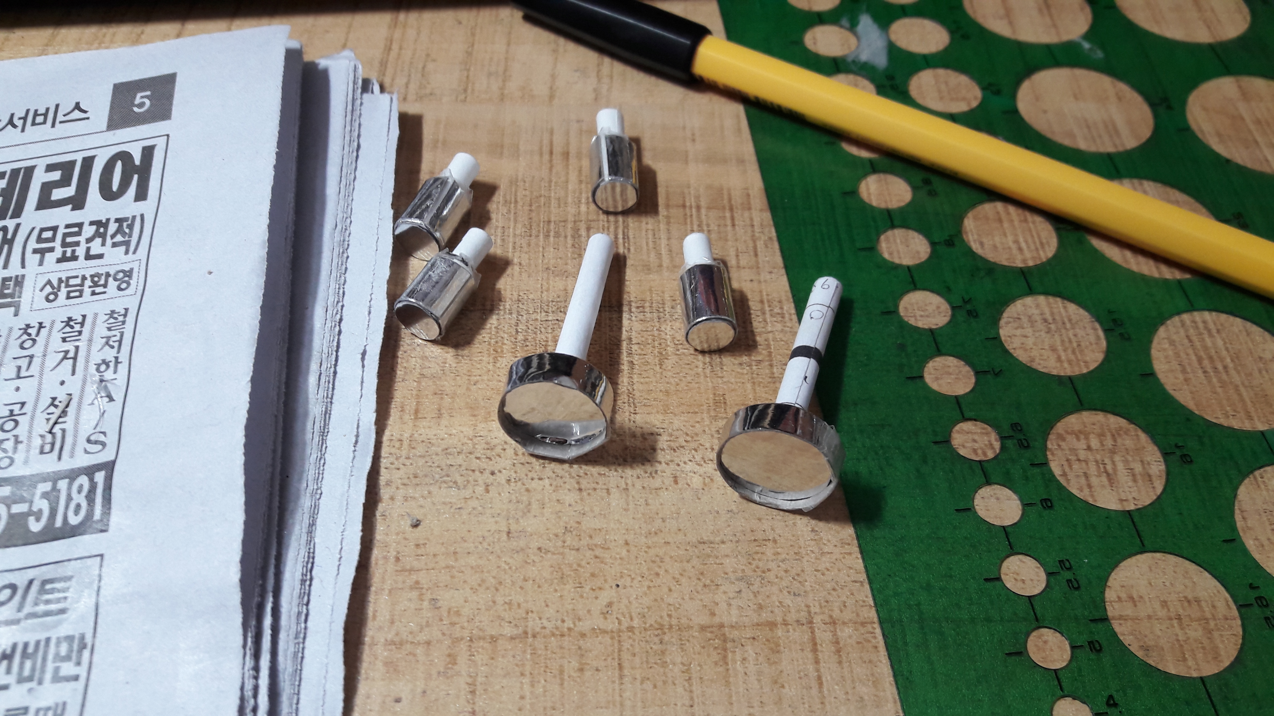 가스레인지의 다리 부분이에요 마지막 부분을 조금 두껍게 해 준 다음에 저렇게 은박 도화지로 감싸주고 끝부분을 동그랗게 음악 도화지로 다시 붙여 주면 나름 메탈릭 힘이납니다